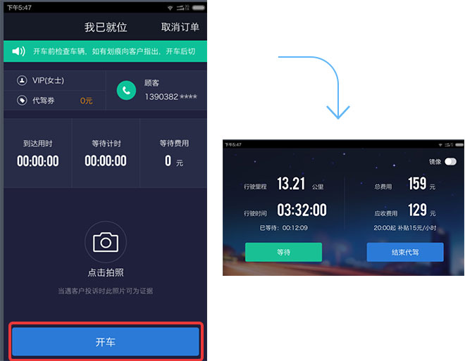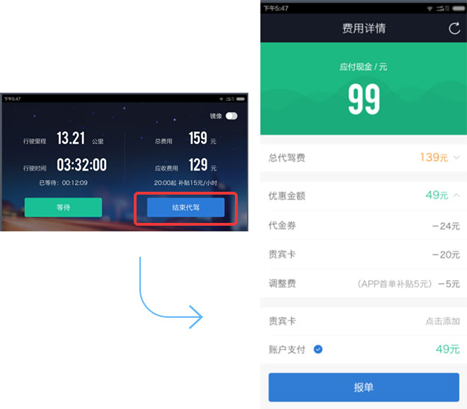 代驾结束后,点击“结束代驾”,司机寻找安全地带停车,关闭用电设施、车门车窗,检查车辆档位,并将手刹拉起,向客户展示计价器应收费用,主动找零。