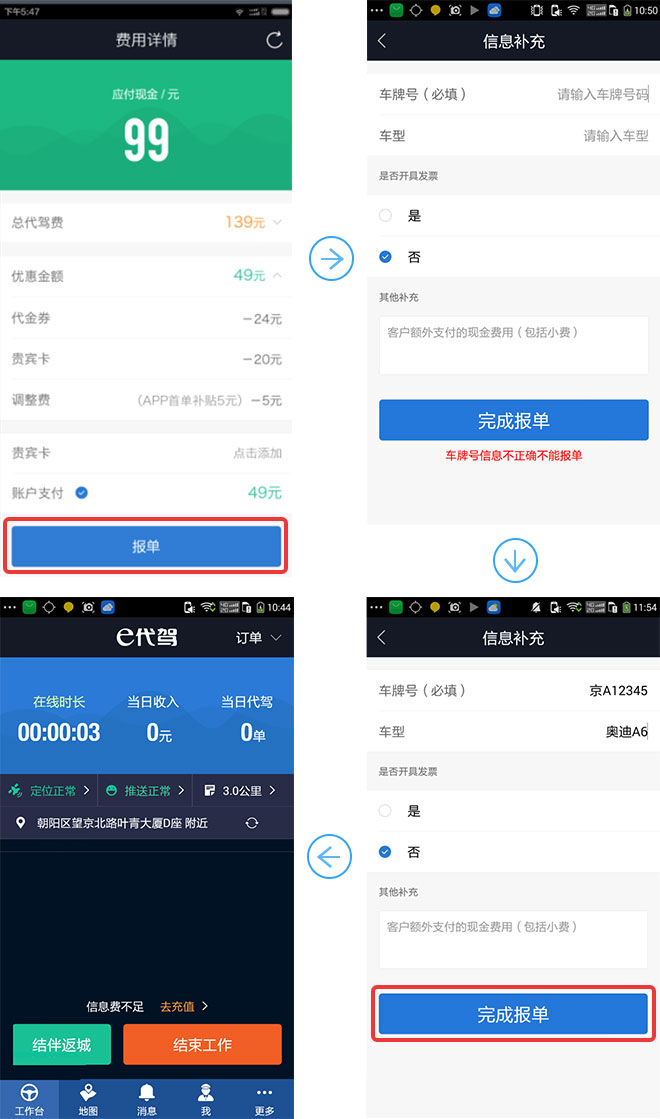 下车后点击“报单”,输入客户的车牌号以及车辆型号,点击“完成报单”,回到初始工作台界面等待接单。