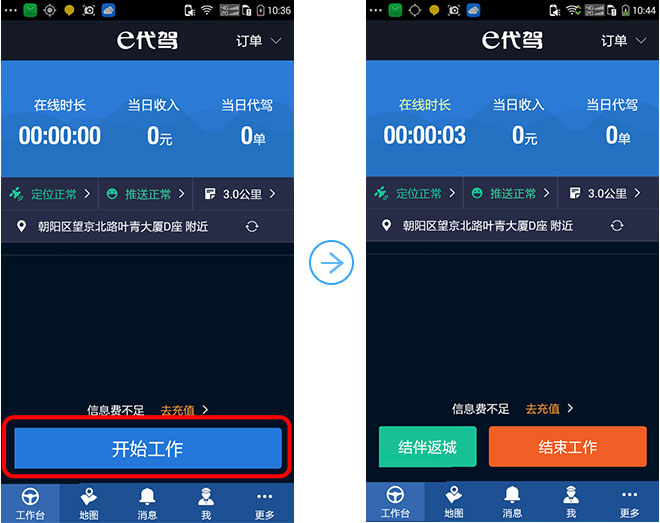 请司机带好公司配备装备,备好零钱,调整心态,打开司机端,点击“开始工作”,准备接单。
