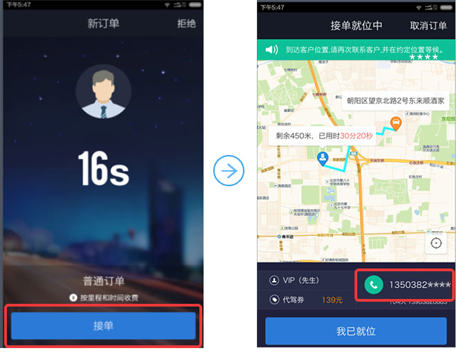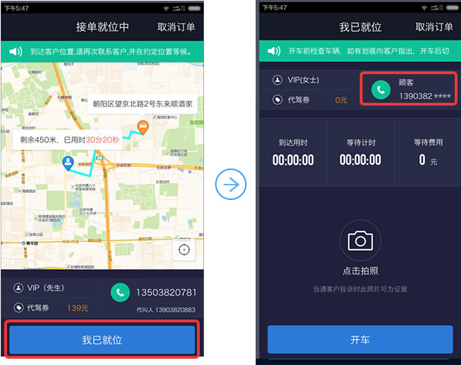 到达客户指定地点后,在司机端点击“我已就位”,联系客户,并在此等候。